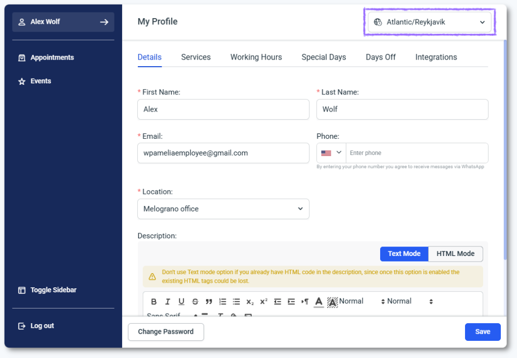 スタッフはマイページの右上のドロップダウンを使用して、表示タイムゾーンを一時的に変更できます。これは画面上の予約や繰り返しイベントの時間の表示方法にのみ影響します。ページが更新されると、マイページは保存されているスタッフのタイムゾーンに戻ります。このオプションは管理画面に保存されているタイムゾーンを更新しません。